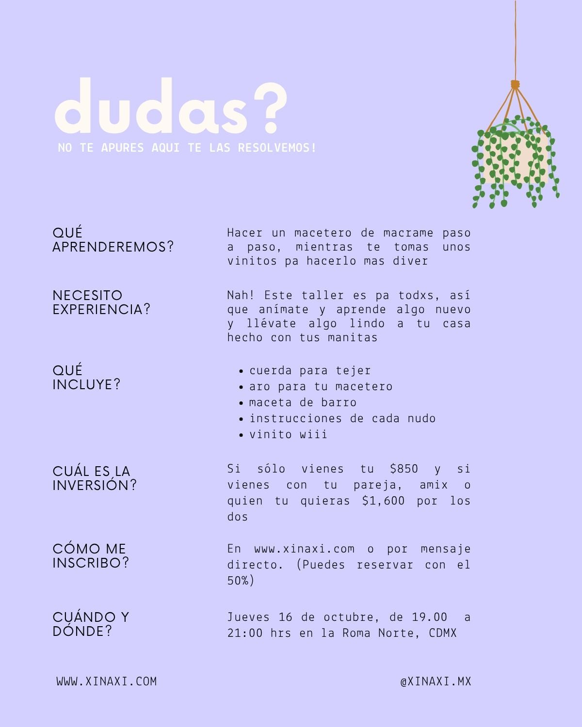 Este taller está diseñado para todxs, ¡desde principiantes hasta expertos en macramé! Tons solo trae ganas de aprender, convivir y pasarla lindiii.